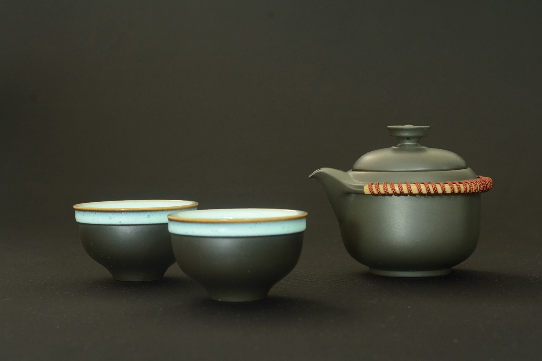 首創多媒體運用,以陶完成茶壺主體後,在握執處環鑲藤片,加強隔熱效果,並以結繩纏繞,除以實用機能外,更添質感!